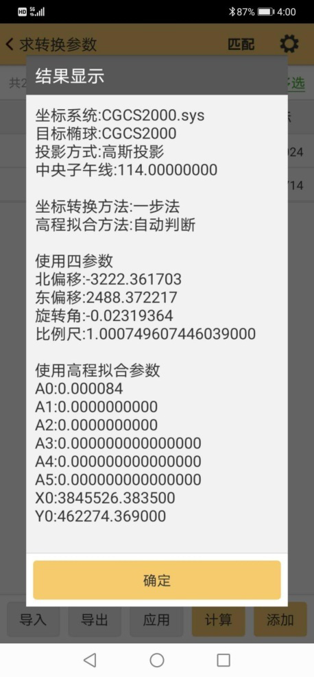 12、點(diǎn)擊“計(jì)算”,軟件會(huì)計(jì)算出參數(shù)并彈出結(jié)果。一般情況下計(jì)算出的參數(shù)中,“比例尺”應(yīng)介于0.95~1.05之間,如果超出這個(gè)范圍,則說明坐標(biāo)誤差過大,應(yīng)檢查剛才輸入的已知坐標(biāo)的是否正確。修改后,重新計(jì)算。