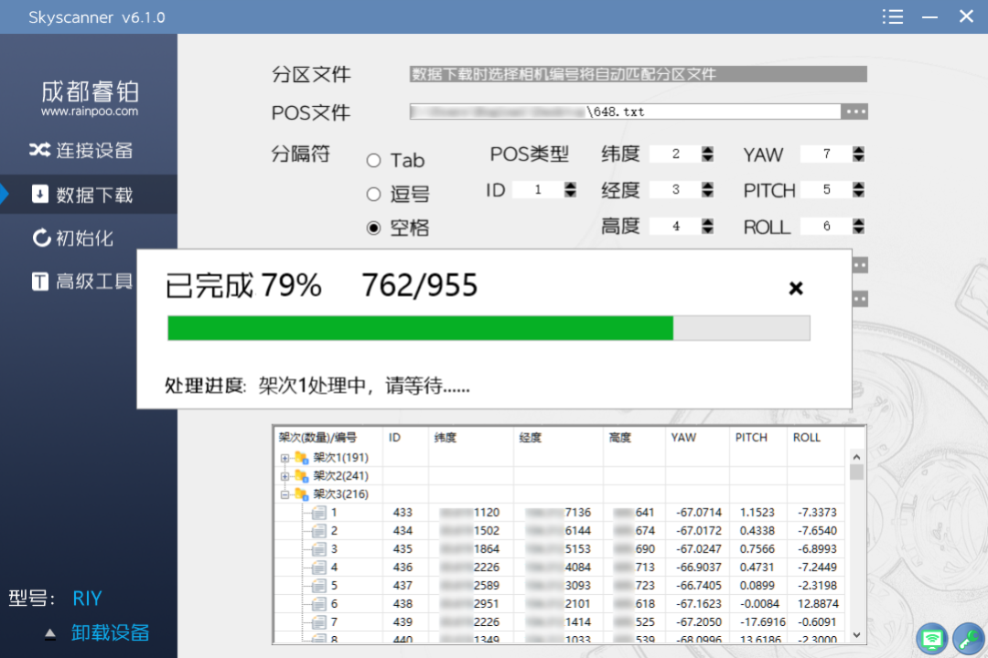 飛機(jī)開機(jī)檢查飛機(jī)狀態(tài)、操控模式、傳感器狀態(tài),測試相機(jī)拍照。 上傳航線、開始飛行,監(jiān)控飛行姿態(tài)、氣象條件、相機(jī)工作狀態(tài)。任務(wù)執(zhí)行完/低電返航,斷點(diǎn)續(xù)飛。無人機(jī)的飛行安全也不容忽視,有很多潛在的原因都有可能導(dǎo)致“炸機(jī)”事故,睿鉑為大家整理了最為常見的八種“炸機(jī)”原因,可以點(diǎn)擊鏈接進(jìn)行查閱:“提控回家”的八大原因與“炸機(jī)”預(yù)防措施 七、數(shù)據(jù)檢查預(yù)處理 飛行完成后,檢查飛行數(shù)據(jù)也是一個很重要的工作,我們要確認(rèn)無人機(jī)采集的航片能夠用于內(nèi)業(yè)數(shù)據(jù)處理,以免等數(shù)據(jù)發(fā)回后才發(fā)現(xiàn)數(shù)據(jù)不能用,這將極大地延誤項(xiàng)目實(shí)施進(jìn)度,造成工期延誤與預(yù)算浪費(fèi)。數(shù)據(jù)下載一般分為POS數(shù)據(jù)下載與影像下載。 POS數(shù)據(jù)包含航片的地理位置信息,會參與到后期空三加密運(yùn)算之中,直接影響模型的精度。較為常見的問題是:POS丟失、POS數(shù)據(jù)錯位。外業(yè)人員需要檢查記錄的拍照次數(shù)與記錄的POS數(shù)據(jù)是否能對應(yīng),如有缺失,應(yīng)及時補(bǔ)救。POS數(shù)據(jù)錯位存在于五鏡頭數(shù)據(jù)不能統(tǒng)一拷貝的相機(jī)中,一般是人為原因造成。睿鉑相機(jī)都會配置五鏡頭數(shù)據(jù)統(tǒng)一拷貝功能,可一鍵下載POS數(shù)據(jù)并按照一定順序排列好,方便內(nèi)業(yè)同事使用。 ![]() 航飛完成后,外業(yè)人員應(yīng)當(dāng)檢查獲取的航片質(zhì)量,判斷影像是否清晰、色彩是否均勻、是否存在漏片現(xiàn)象等問題。如果存在,應(yīng)采取補(bǔ)救措施;如果數(shù)據(jù)合格,應(yīng)及時下載、分類保存好數(shù)據(jù),交付內(nèi)業(yè)同事使用。睿鉑Sky-scanner數(shù)據(jù)預(yù)處理軟件,可支持一鍵數(shù)據(jù)導(dǎo)出并自動分類整理,Pros系列數(shù)據(jù)拷貝速度更是超過300MB/s,減輕外業(yè)工作負(fù)擔(dān)。